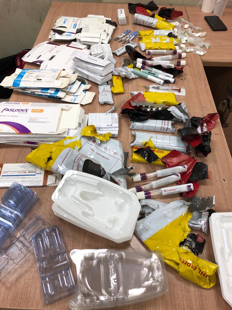 وبتفتيش حقائبه على جهاز الفحص بالأشعة بواسطة يوسف حامد يوسف مأمور الجمرك تلاحظ له وجود لفافات بداخلها كثافات معتمة، قام محمد الهادي أحمد مدير الحركة المشرف على صالة الوصول بمبنى الركاب رقم ٢ بتكليف الدكتورة ابتهال مصطفى مأمور الجمرك بتفتيش حقائب الراكب يدويا مما أسفر عن ضبط ٥٩ أمبولًا و٣ شرائط دوائية خاصة بعلاج أمراض السرطان والغضروف والصداع النصفي بإجمالي ٦٢ عبوة مخبئين داخل أكياس بلاستيك وسط الملابس وملفوفين بأوراق الكربون الأسود حتى لا تظهر على جهاز الفحص تقدر القيمة المبدئية لها ما يقارب النصف مليون جنيه.