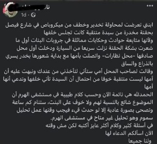 استمع فريق من رجال مباحث مديرية أمن الجيزة لفتاة ادَّعى والدُها عبر الـ"فيس بوك"، أنها تعرَّضت لمحاولة اختطاف أثناء استقلالها سيارة "ميكروباص" بمنطقة فيصل من قِبل إحدى السيدات كانت تجلس بالمقعد الخلفى لها عقب قيامها بوخذها "بإبرة" تحوى مادة مخدرة؛ حيث نفت الفتاة صحة واقعة قيام سيدة منتقبة بحقنها أو محاولة خطفها ولم يحدث لها مكروه.