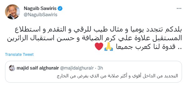 وكتب نجيب ساويرس تغريدة على تويتر "بلدكم تتجدد يوميا ومثال طيب للرقي والتقدم واستطلاع المستقبل علاوة على كرم الضيافة وحسن استقبال الزائرين.. قدوة لنا كعرب جميعا".