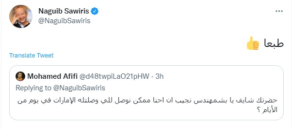 وعندما سأله أحد متابعيه "حضرتك شايف يا بشمهندس نجيب إن إحنا ممكن نوصل للي وصلتله الإمارات في يوم من الأيام؟"