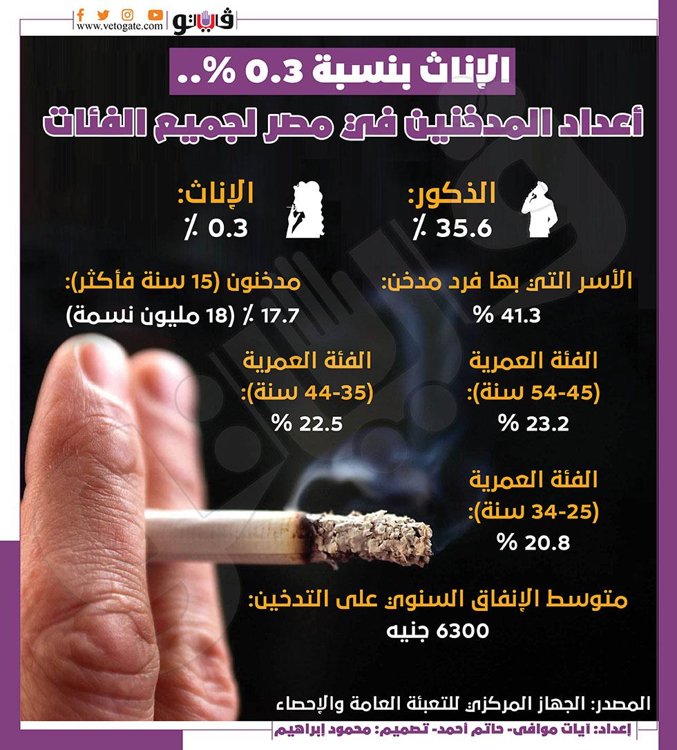 الإناث بنسبة 0.3%.. أعداد المدخنين في مصر لجميع الفئات | انفوجراف السبت 04/يونيو/2022 - 04:00 م 6/4/2022 4:00:11 PM المدخنين في مصر آيات الموافي - حاتم أحمد شارك طباعة 18 حجم الخط شارك طباعة المدخنين تدخين السجائر الجهاز المركزى للتعبئة العامة والإحصاء الأسر التي بها فرد مدخن نسبة المدخنين