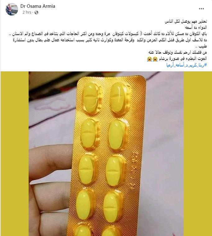 وكتب أسامة أرميا تدوينة على الفيس بوك "تحذير مهم يوصل لكل الناس.. الدواء ده أسمه باي الكوفان ده مسكن للآلام ده كانك أخدت 3 كبسولات كيتوفان مرة وحده ومن اكتر الحاجات اللي بتتاخد في الصداع والم الاسنان.."