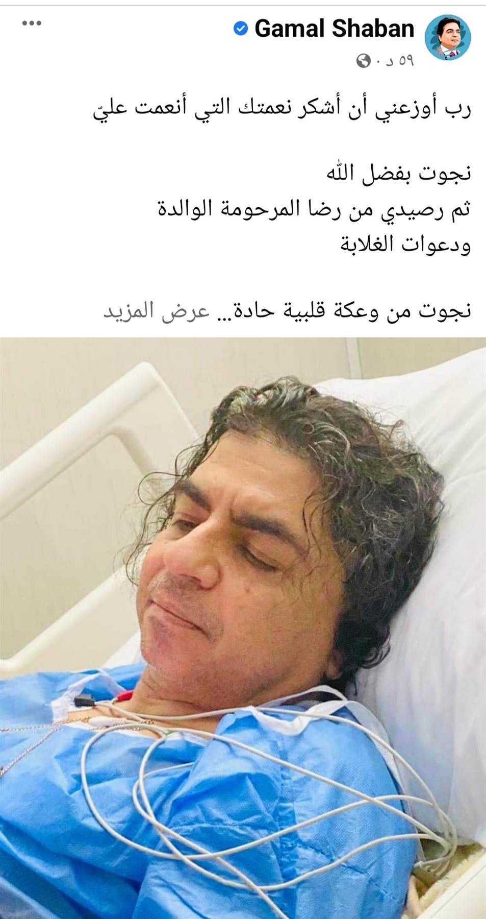 وكتب الدكتور جمال شعبان على صفحته الرسمية على موقع التواصل الاجتماعي فيس بوك: "رب أوزعني أن أشكر نعمتك التي أنعمت عليّ نجوت بفضل الله، م رصيدي من رضا المرحومة الوالدة ودعوات الغلابة، نجوت من وعكة قلبية حادة".