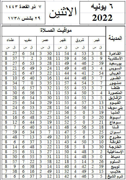 مواقيت الصلاة اليوم وفقًا للتوقيت المحلي لمدينتي القاهرة والإسكندرية وعدد من مدن ومحافظات الجمهورية: