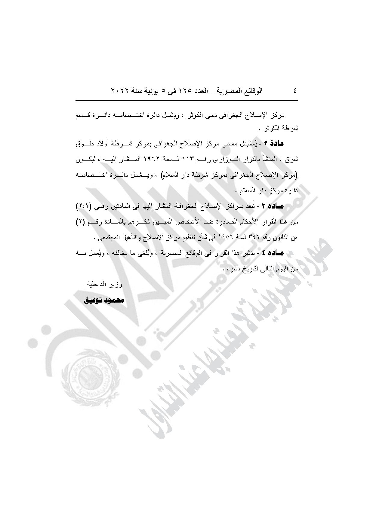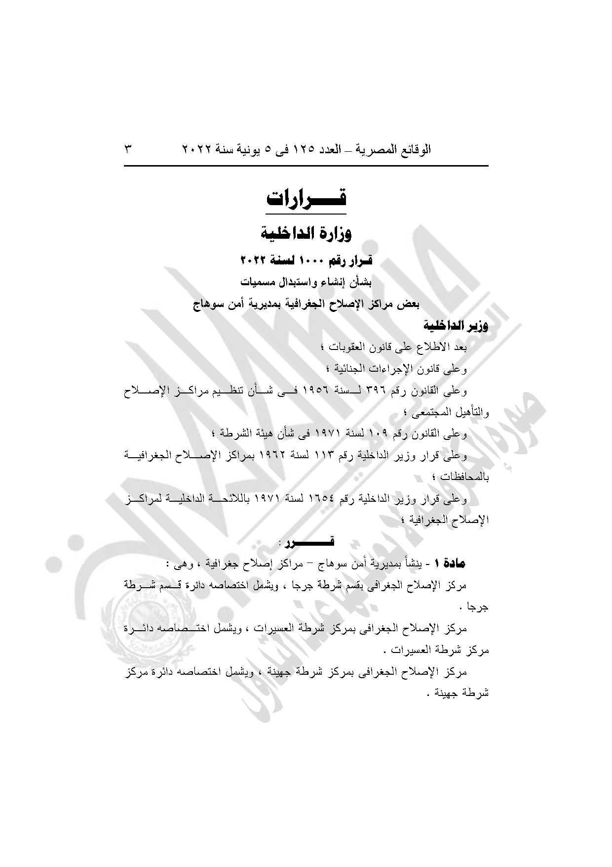 -القرار وزير الداخلية رقم 1000 لسنة 2022، بشأن إنشاء واستبدال مسميات بعض مراكز الاصلاح الجغرافية بمديرية أمن سوهاج.