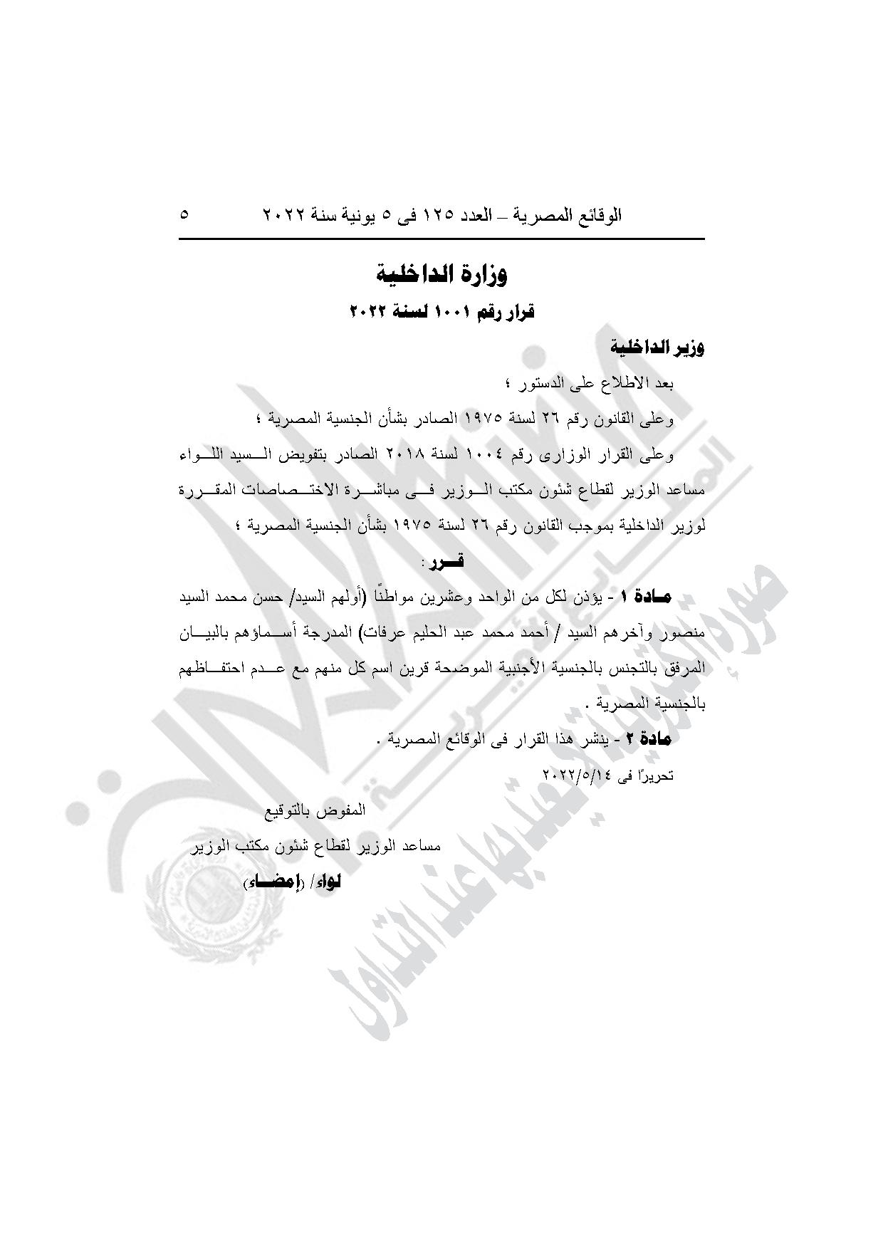 -القرار وزير الداخلية رقم 1001 لسنة 2022، بشأن الأذن لكل من الواحد وعشرين مواطنا (أولهم حسن محمد السيد منصور، وآخرهم أحمد محمد عبد الحليم عرفات) المدرجة أسماؤهم بالبيان بالتجنس بالجنسية الأجنبية الموضحة قرين اسم كل منهم مع عدم احتفاظهم بالجنسية المصرية.