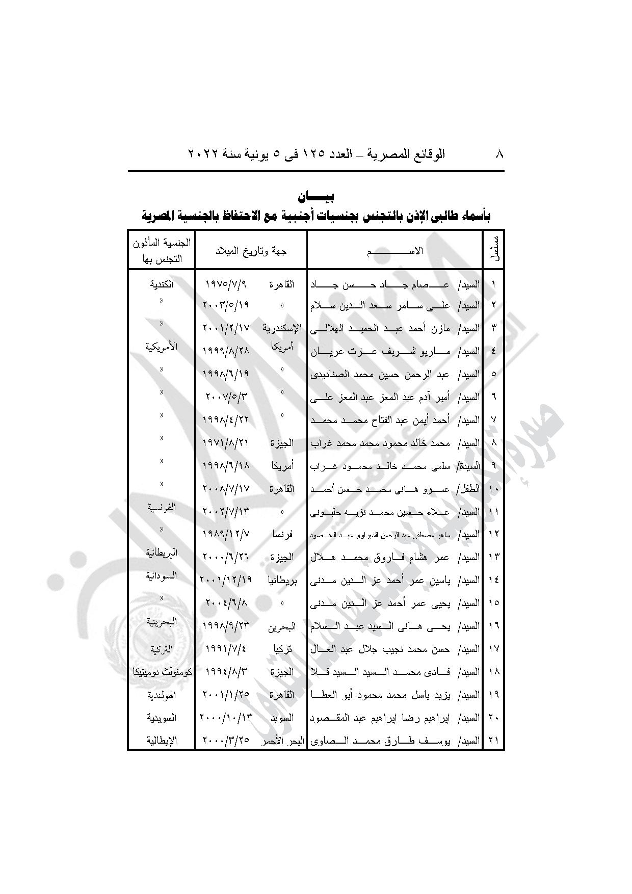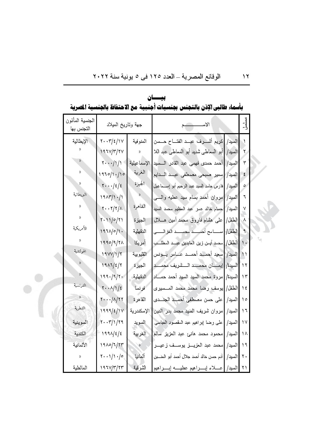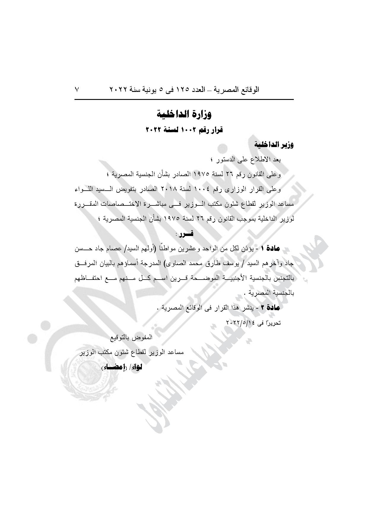 -قرار وزير الداخلية رقم 1002 لسنة 2022، بشأن الأذن لكل من الواحد وعشرين مواطنا (أولهم عصام جاد حسن جاد، وآخرهم يوسف طارق محمد الصاوى) المدرجة أسماؤهم بالبيان المرفق بالتجنس بالجنسية الأجنبية الموضحة قرين اسم كل منهم مع احتفاظهم بالجنسية المصرية.