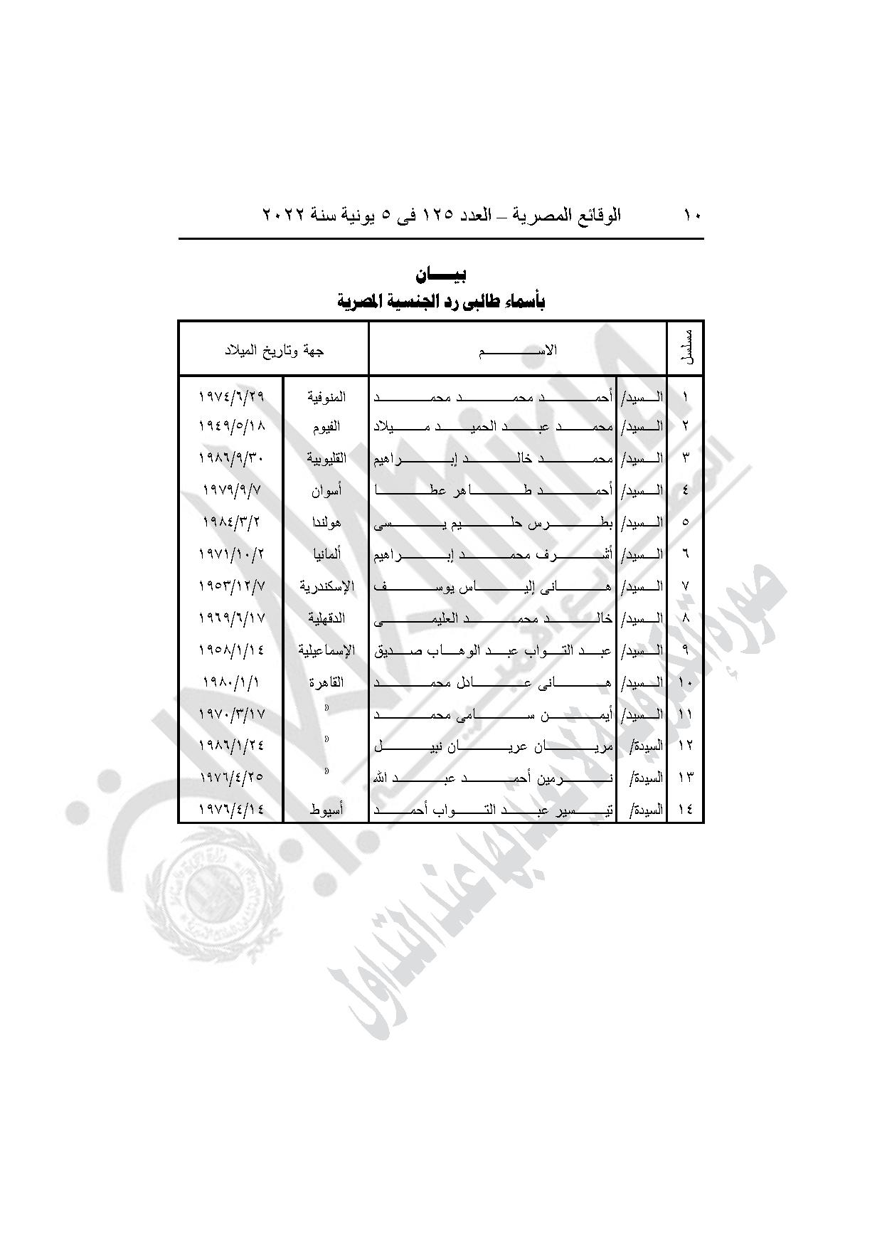 -قرار وزير الداخلية رقم 1005 لسنة 2022، بشأن ترد الجنسية المصرية لكل من الأربعة عشر شخصا المدرجة أسماؤهم بالبيان المرفق (أولهم أحمد محمد محمد، وآخرهم تيسير عبد التواب أحمد).
