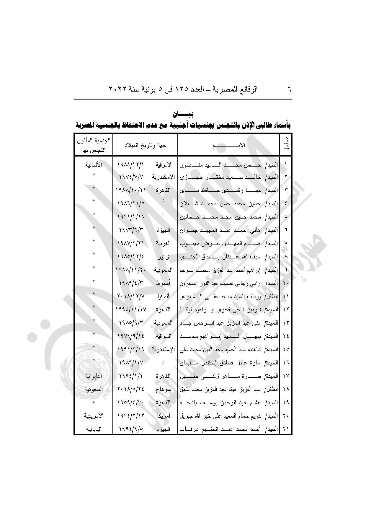 نشرت جريدة الوقائع المصرية في عددها رقم 125، الصادر في 5 يونيو 2022، قرارات وزارة الداخلية بشأن سحب الجنسية المصرية من 21 مواطنًا، ورد الجنسية المصرية لـ14 مواطنًا، والأذن لـ42 مواطنًا التجنس بالجنسية الأجنبية مع احتفاظهم بالجنسية المصرية.