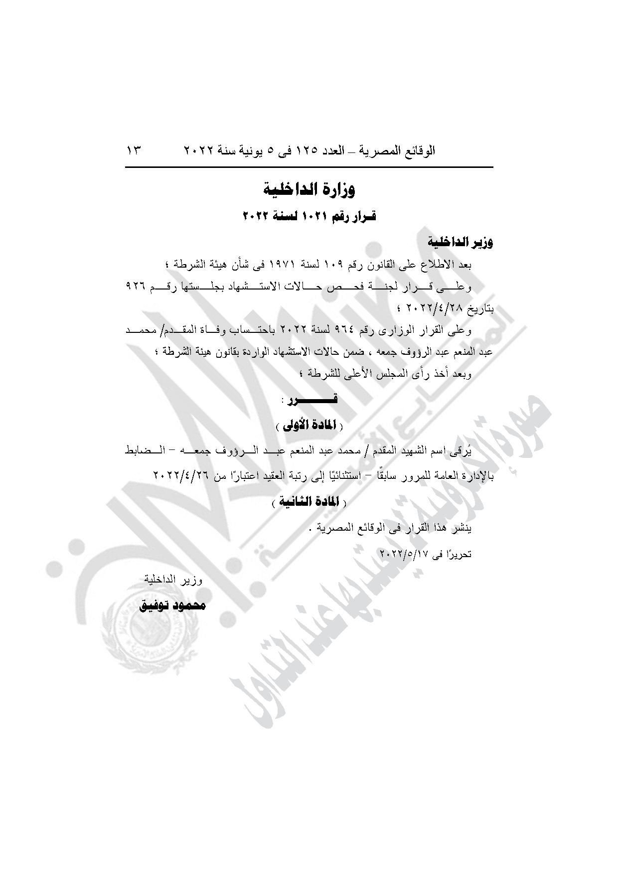 -قرار وزير الداخلية رقم 1021 لسنة 2022، بشأن منح الترقية لاسم الشهيد المقدم/ محمد عبد المنعم عبد الرؤوف جمعه- الضابط بالادارة العامة للمرور سابقا- استثنائيا الى رتبة العقيد اعتبارا من 2022/4/26.