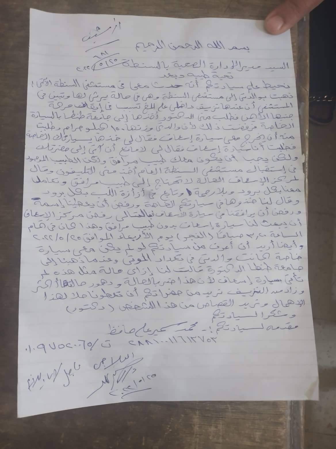 واضاف "سمير"والذى كان رفقة والدته أنه تقدم بشكوى للإدارة الصحية بالسنطة وحرر محضرا بقسم الشرطة ضد الطبيب المتسبب في ذلك.