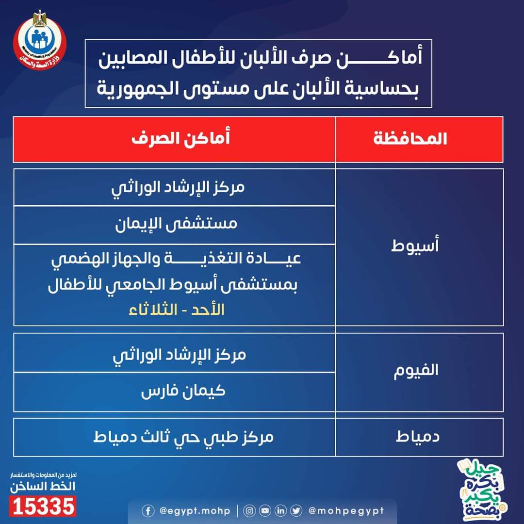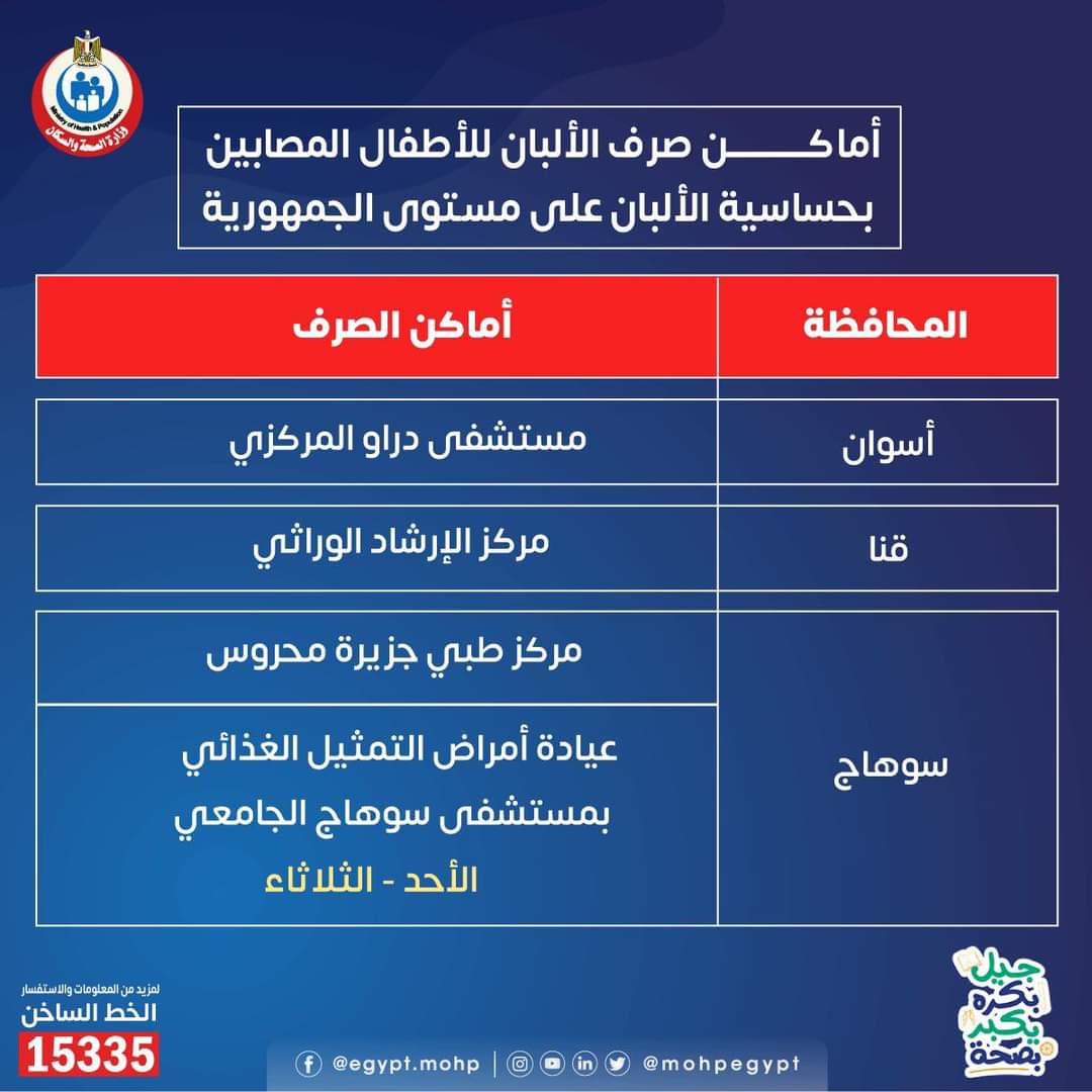 أعلنت وزارة الصحة عن عناوين اماكن توفير ألبان الأطفال المصابين بحساسية الألبان في كل المحافظات حيث يتم توفيرها بالمجان شرط تأكيد إصابة الطفل بحساسية الألبان.