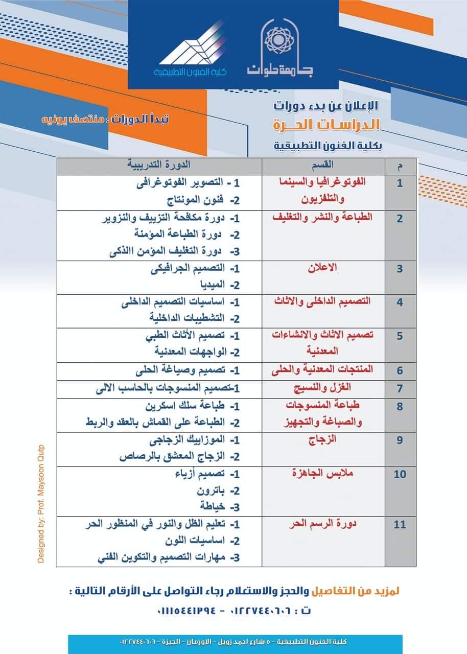 فنون تطبيقية حلوان تنظم دورات الدراسات الحرة في منتصف يونيو
