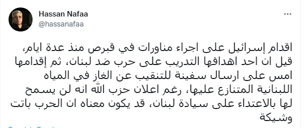 وكتب الدكتور حسن نافعة تغريدة على تويتر "اقدام إسرائيل على اجراء مناورات في قبرص منذ عدة ايام، قيل ان احد اهدافها التدريب على حرب ضد لبنان، ثم إقدامها امس على ارسال سفينة للتنقيب عن الغاز في المياه اللبنانية المتنازع عليها، رغم اعلان حزب الله انه لن يسمح لها بالاعتداء على سيادة لبنان، قد يكون معناه ان الحرب باتت وشيكة".