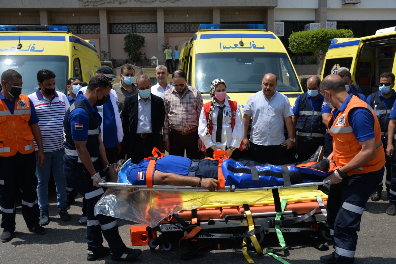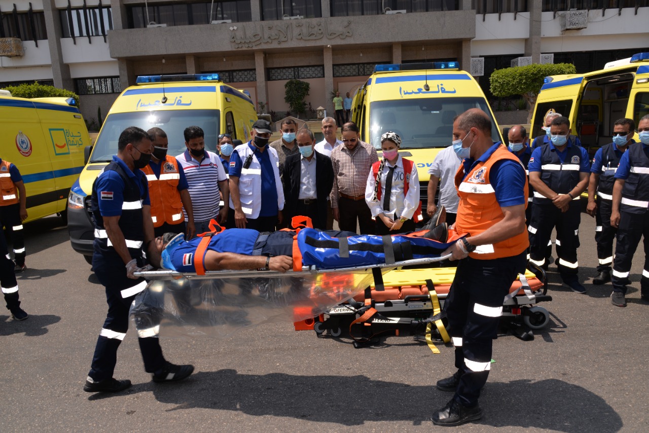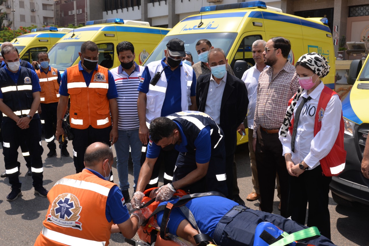 و خلال تفقد الإصطفاف، شاهد المحافظ تنفيذ محاكاة لإنقاذ مصاب، قام بها مسعفو هيئة الإسعاف بالإسماعيلية وتم التعامل طبقا للتعليمات القياسية للإسعاف خلال المدة الزمنية اللازمة باستخدام كافة امكانيات السيارات الجديدة.