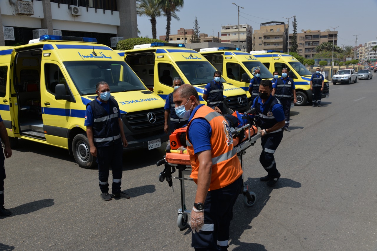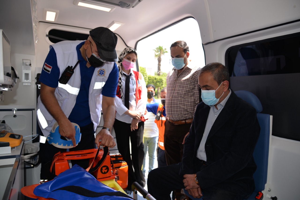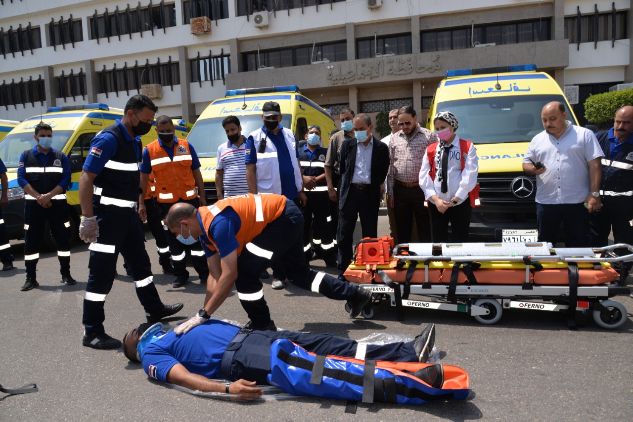 و خلال تفقد الإصطفاف، شاهد المحافظ تنفيذ محاكاة لإنقاذ مصاب، قام بها مسعفو هيئة الإسعاف بالإسماعيلية وتم التعامل طبقا للتعليمات القياسية للإسعاف خلال المدة الزمنية اللازمة باستخدام كافة امكانيات السيارات الجديدة.