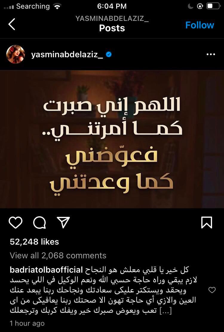 كتبت الفنانة ياسمين عبد العزيز تعليقا جديدا على حسابها الشخصي عبر موقع تبادل الصور والفيديوهات "إنستجرام" وذلك بعد تردد أنباء عن انفصالها من زوجها الفنان أحمد العوضي.