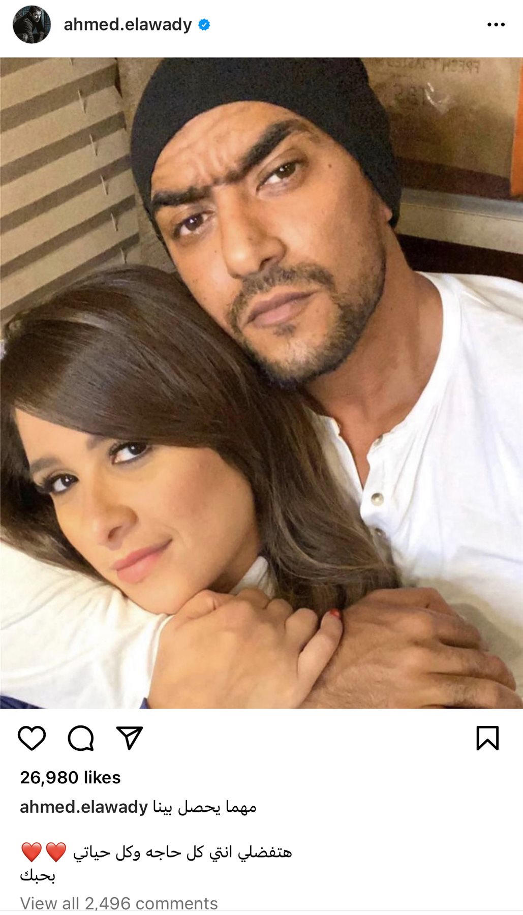 في أول تعليق للفنان أحمد العوضي على أخبار انفصاله عن زوجته الفنانة ياسمين عبد العزيز، نشر العوضي صورةً له مع ياسمين عبر حسابه على موقع الصور والفيديوهات "إنستجرام"، وأرفق الصورة بتعليق قائلًا: "مَهما يحصل بينا هتفضلي إنتي كل حاجة وكل حياتي بحبك".