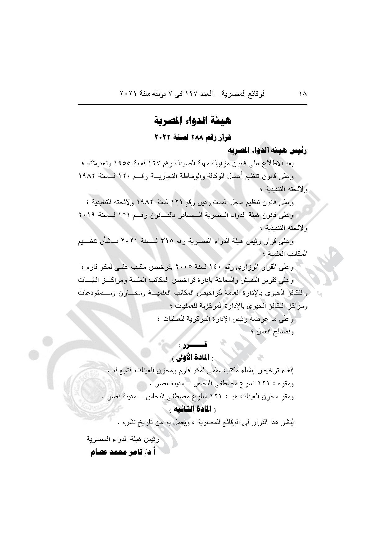 قرار هيئة الدواء رقم 288 لسنة 2022، بإلغاء ترخيص إنشاء مكتب علمي لمكو فارم ومخزن العينات التابع له، بمدينة نصر في القاهرة.