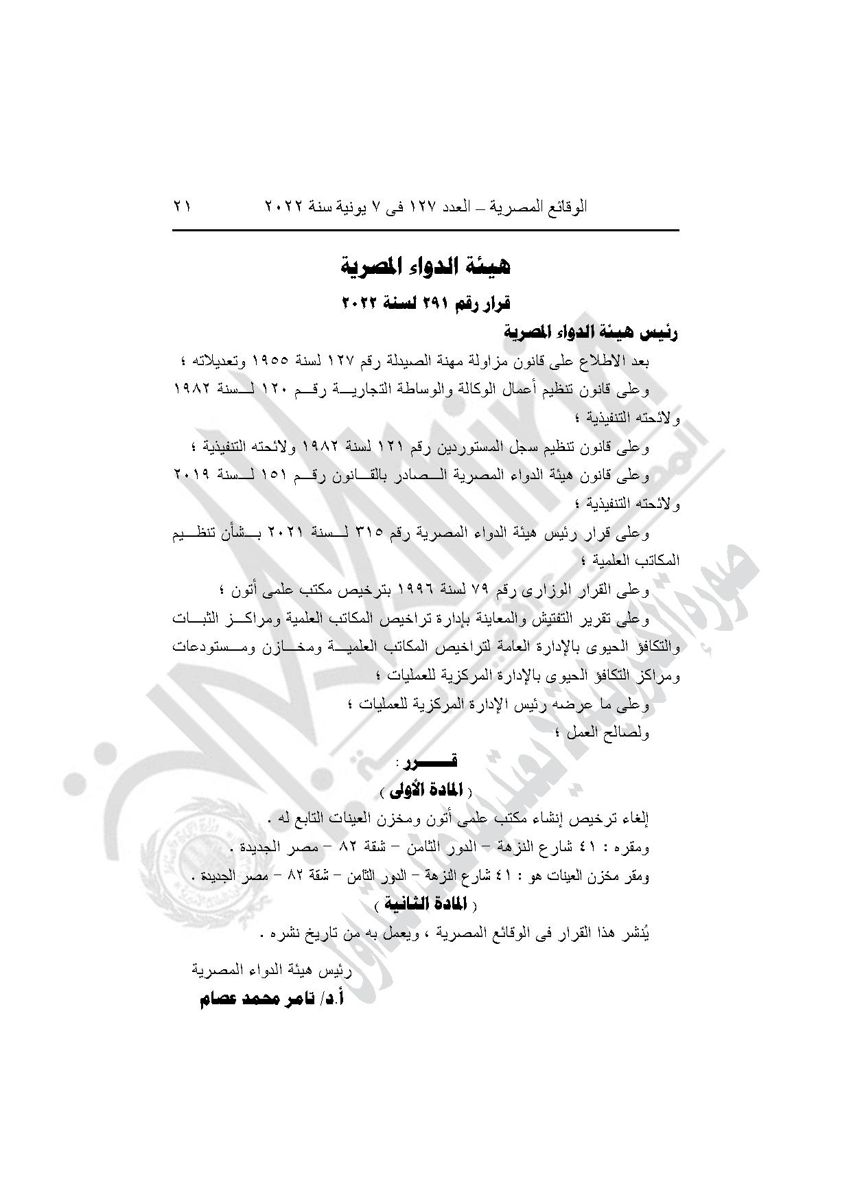 قرار هيئة الدواء رقم 290 لسنة 2022، بإلغاء ترخيص إنشاء مكتب علمي Am Pharma ومخزن العينات التابع له، بمدينة نصر في القاهرة.
