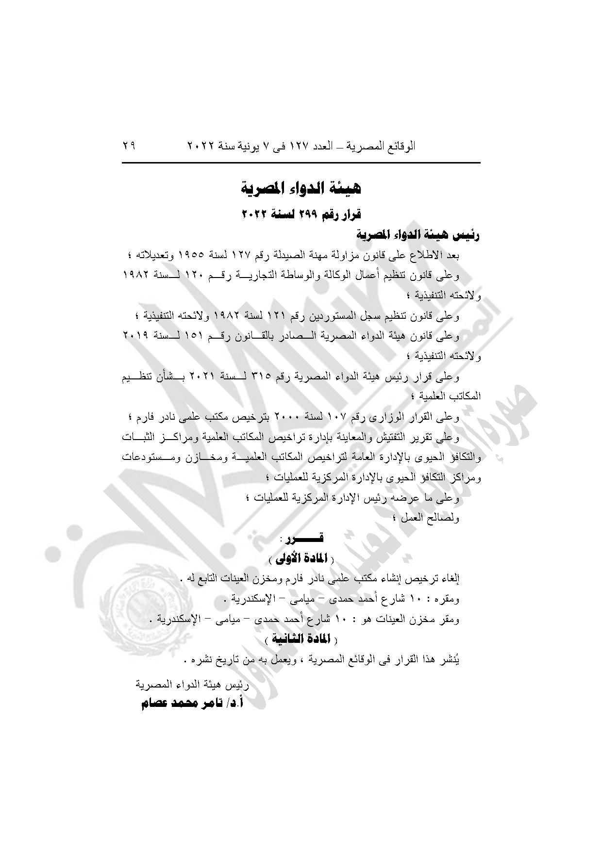 قرار هيئة الدواء رقم 299 لسنة 2022، بإلغاء ترخيص إنشاء مكتب علمي نادر فارما ومخزن العينات التابع له، بميامي في الإسكندرية.