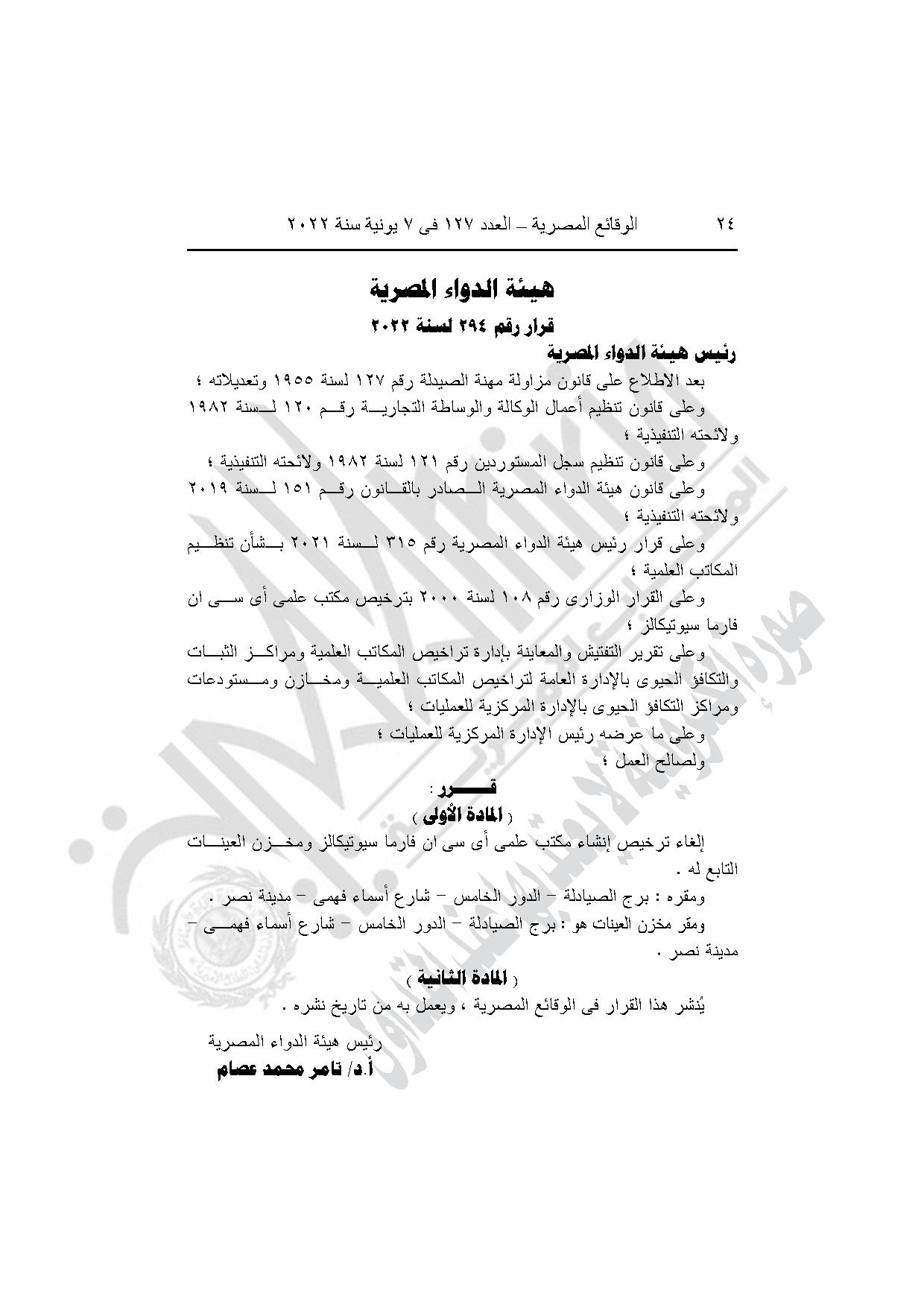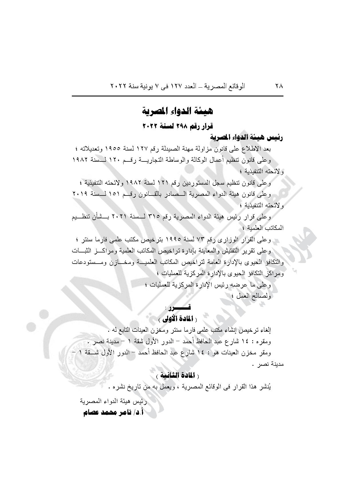 قرار هيئة الدواء رقم 298 لسنة 2022، بإلغاء ترخيص إنشاء مكتب علمي فارما سنتر ومخزن العينات التابع له، بمدينة نصر في القاهرة.