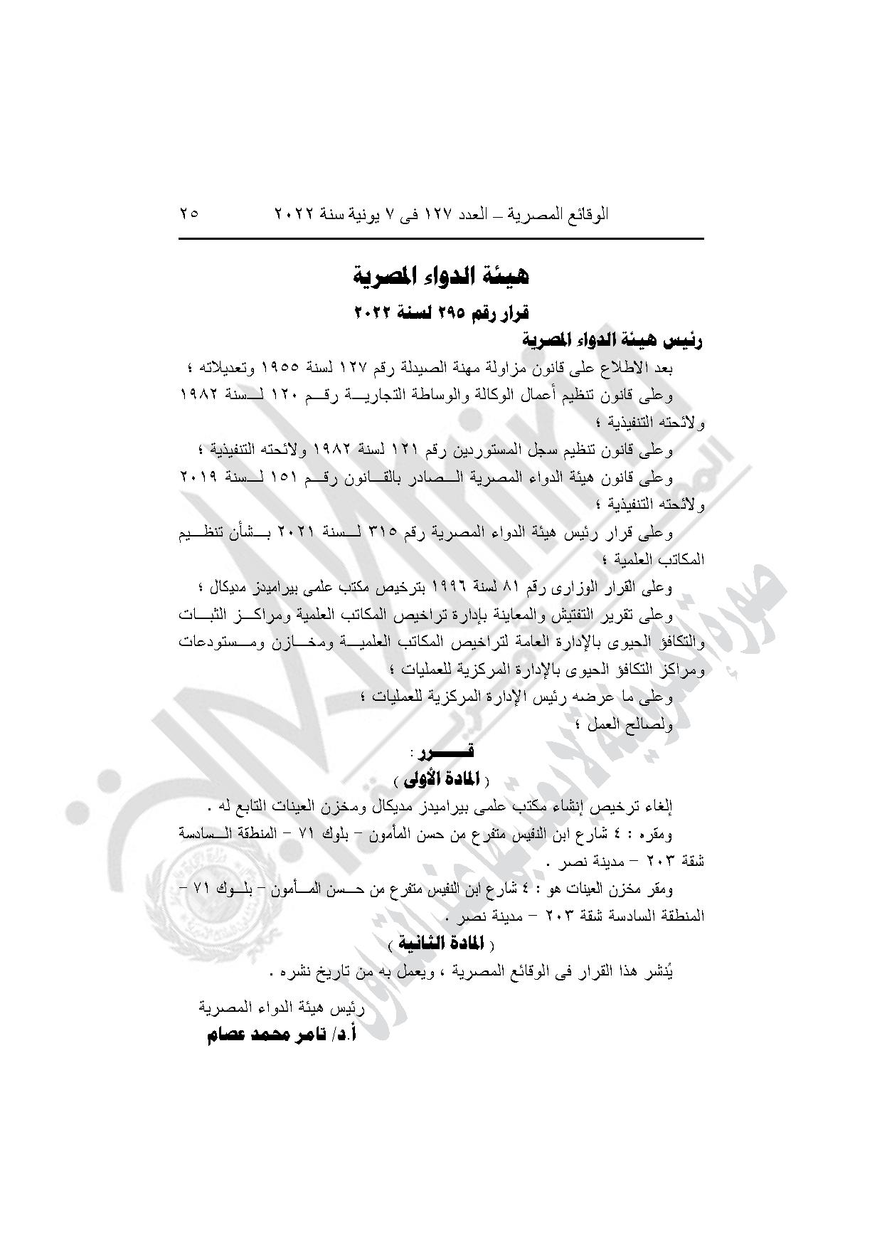 قرار هيئة الدواء رقم 295 لسنة 2022، بإلغاء ترخيص إنشاء مكتب علمي بيراميدز مديكال ومخزن العينات التابع له، بمدينة نصر في القاهرة.