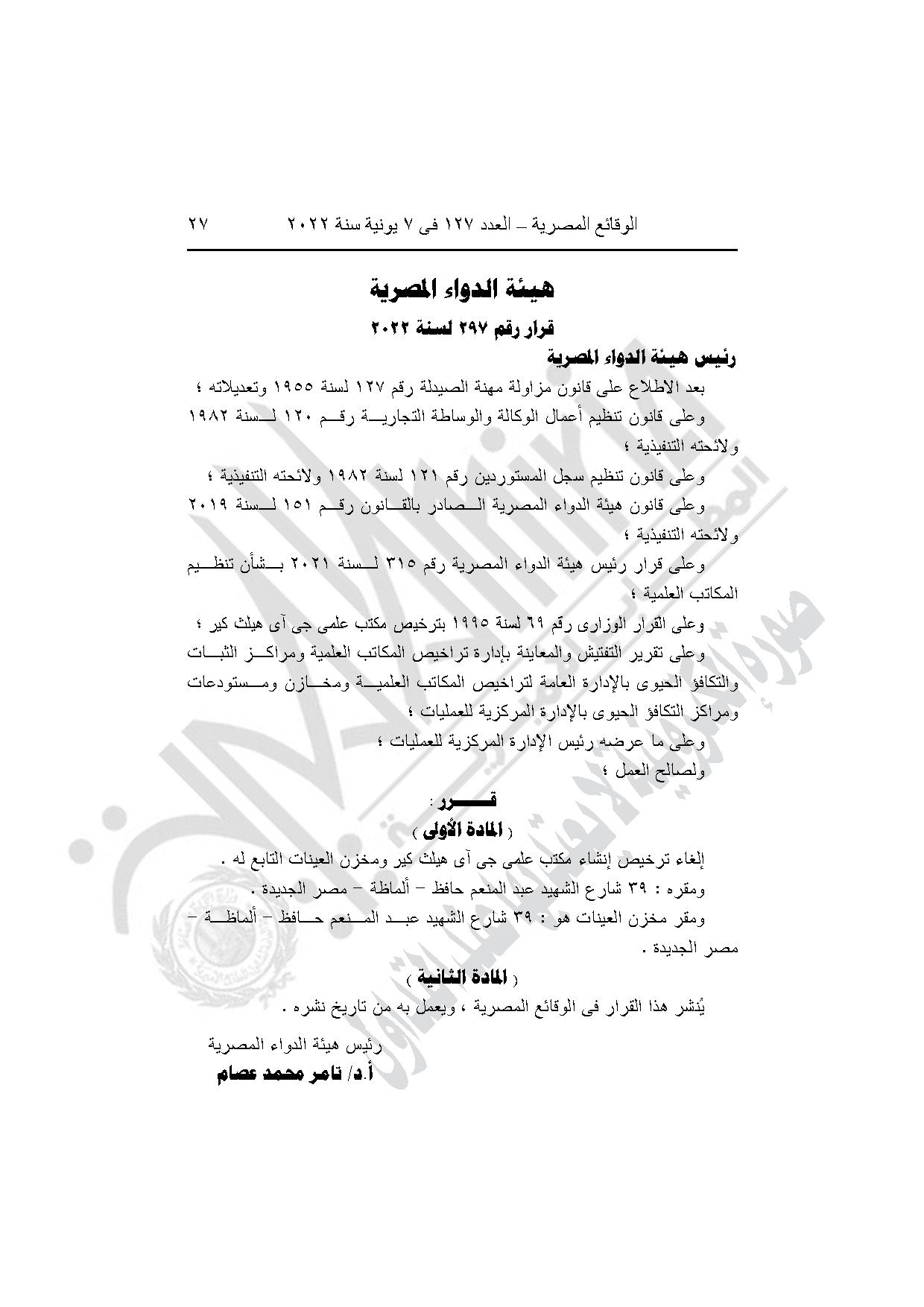 قرار هيئة الدواء رقم 297 لسنة 2022، بإلغاء ترخيص إنشاء مكتب علمي جي آي هيلث كير ومخزن العينات التابع له، بمصر الجديدة في القاهرة.
