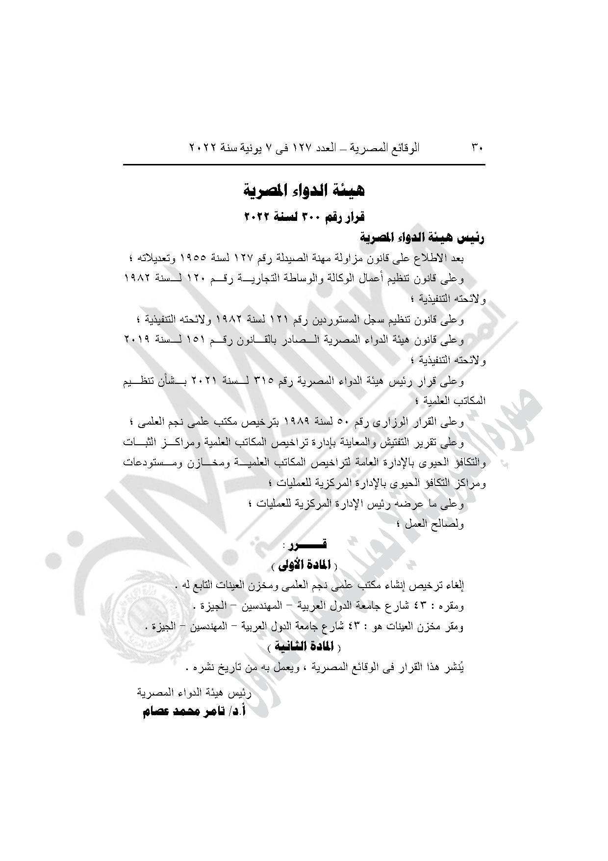 قرار هيئة الدواء رقم 300 لسنة 2022، بإلغاء ترخيص إنشاء مكتب علمي نجم العلمي ومخزن العينات التابع له، بالمهندسين في الجيزة.