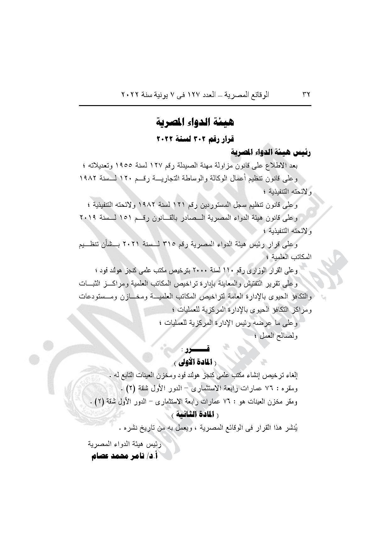 قرار هيئة الدواء رقم 302 لسنة 2022، بإلغاء ترخيص إنشاء مكتب علمي كنجز هولند فود ومخزن العينات التابع له، بعمارات رابعة الاستثماري في القاهرة.