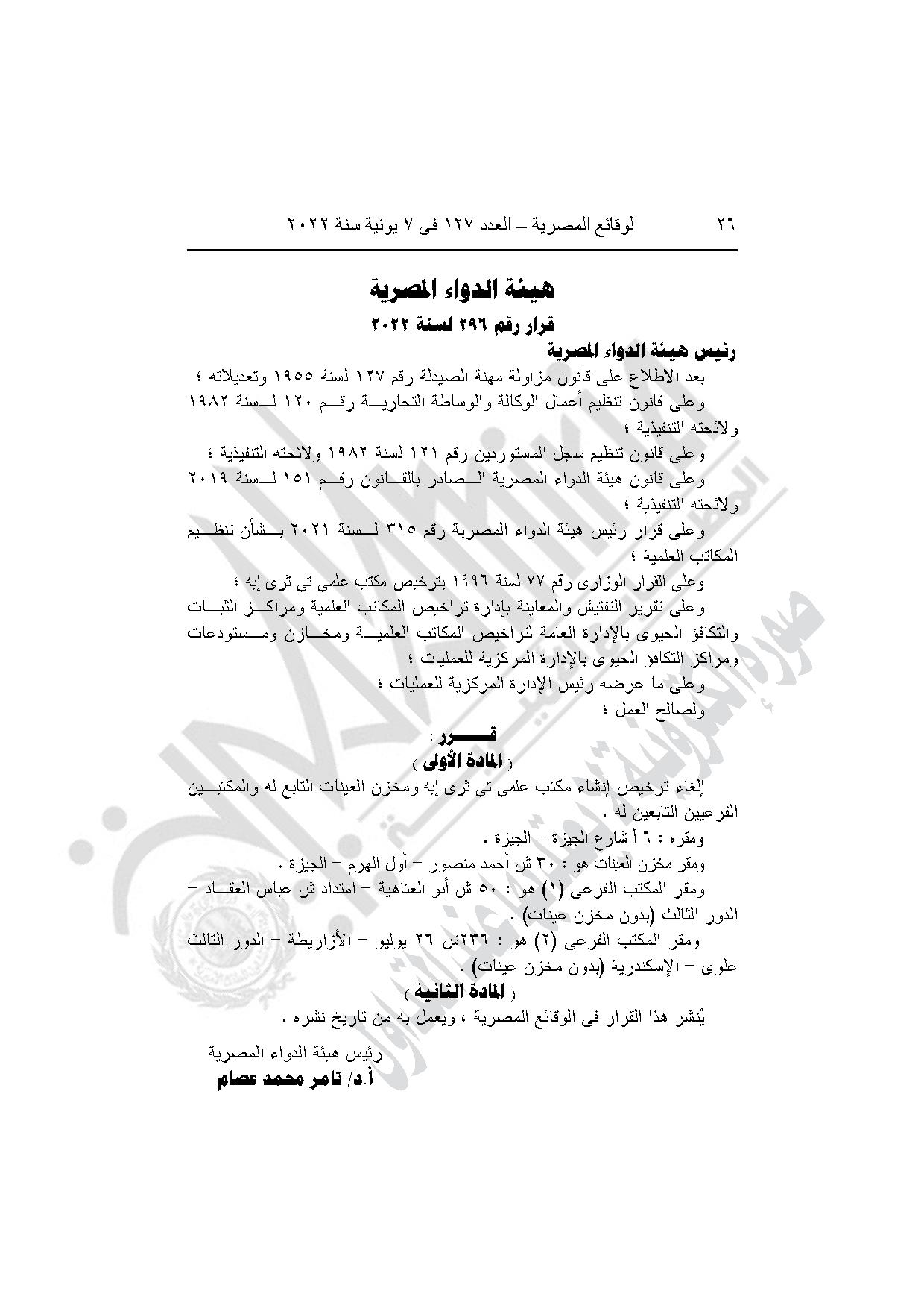 قرار هيئة الدواء رقم 296 لسنة 2022، بإلغاء ترخيص إنشاء مكتب علمي تي ثري إيه ومخزن العينات التابع له، والمكتبين الفرعيين التابعين له. بمدينة الجيزة محافظة الجيزة.