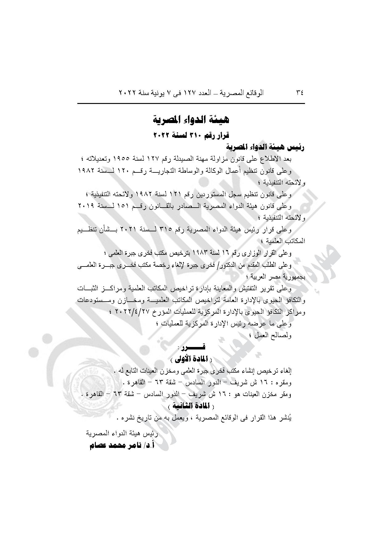 قرار هيئة الدواء رقم 310 لسنة 2022، بإلغاء ترخيص إنشاء مكتب فخري جبرة العلمي ومخزن العينات التابع له، بشارع شريف في القاهرة.