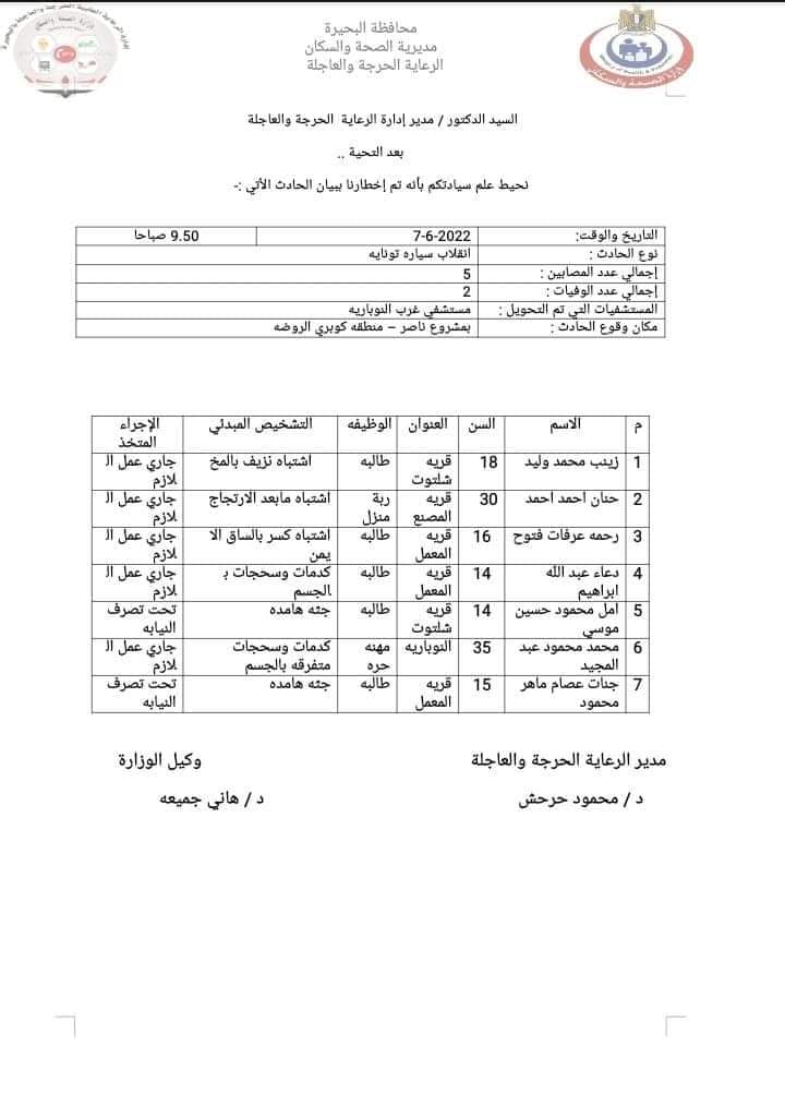 بالأسماء.. الصحة: مصرع وإصابة 7 فتيات بحادث انقلاب سيارة في البحيرة