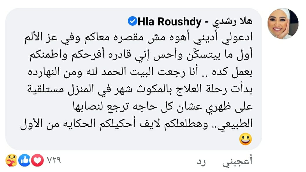 وحرصت هلا على طمأنة جمهورها على حالتها الصحية، إذ كتبت عبر حسابها الشخصي بموقع التواصل الاجتماعي فيسبوك: ادعو لي أديني أهو مش مقصرة معاكم وفي عز الألم، أول ما بيتسكن وأحس إني قادرة أفرحكم واطمنكم بعمل كده، وأنا رجعت البيت الحمد لله.. ومن النهاردة بدأت رحلة العلاج بالمكوث شهر في المنزل مستلقية على ظهري عشان كل حاجة ترجع لنصابها الطبيعي، وهطلع لكم لايف أحكي لكم الحكاية من الأول.