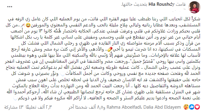 وتابعت هلا رشدي: من كل قلبي بحبكم وزادت غلاوتكم في قلبي، وعرفت قيمتي عندكم.. الحكاية باختصار هُمَّه كانوا 13 يوم، من أصعب أيام حياتي، من غير نوم وبـ أنين بيقطع، في قلبي وجسمي ومفيش على لساني، غير كلمة يا رب بكل أشكالها من قرآن وذكر، بسبب آلام مزمنة متواصلة زي النار القايدة في ظهري، ورجلي الشمال اللي فشلت كل المسكنات في تسكينها، ده أنا ضربت تيمو يا أخي.
