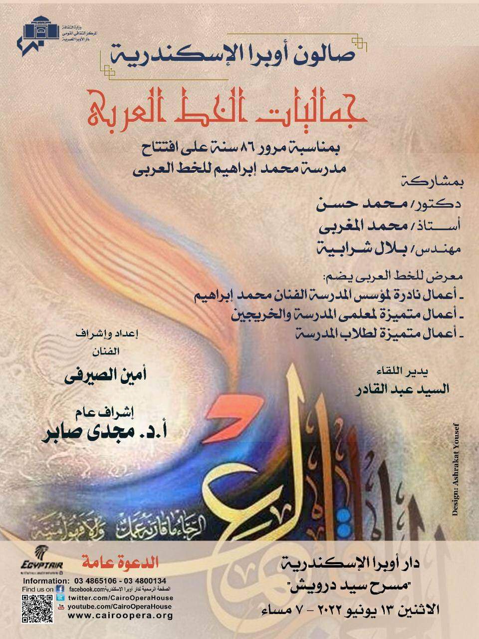 تنظم دار الأوبرا المصرية برئاسة الدكتور مجدي صابر في تمام السابعة من مساء الإثنين المقبل الموافق ١٣ من يونيو الجاري.. "صالون أوبراالاسكندرية الثقافي " وذلك تحت إشراف الفنان آمين الصيرفي مدير عام النشاط الثقافي بدار الأوبرا المصرية عن جماليات الخط العربي..
