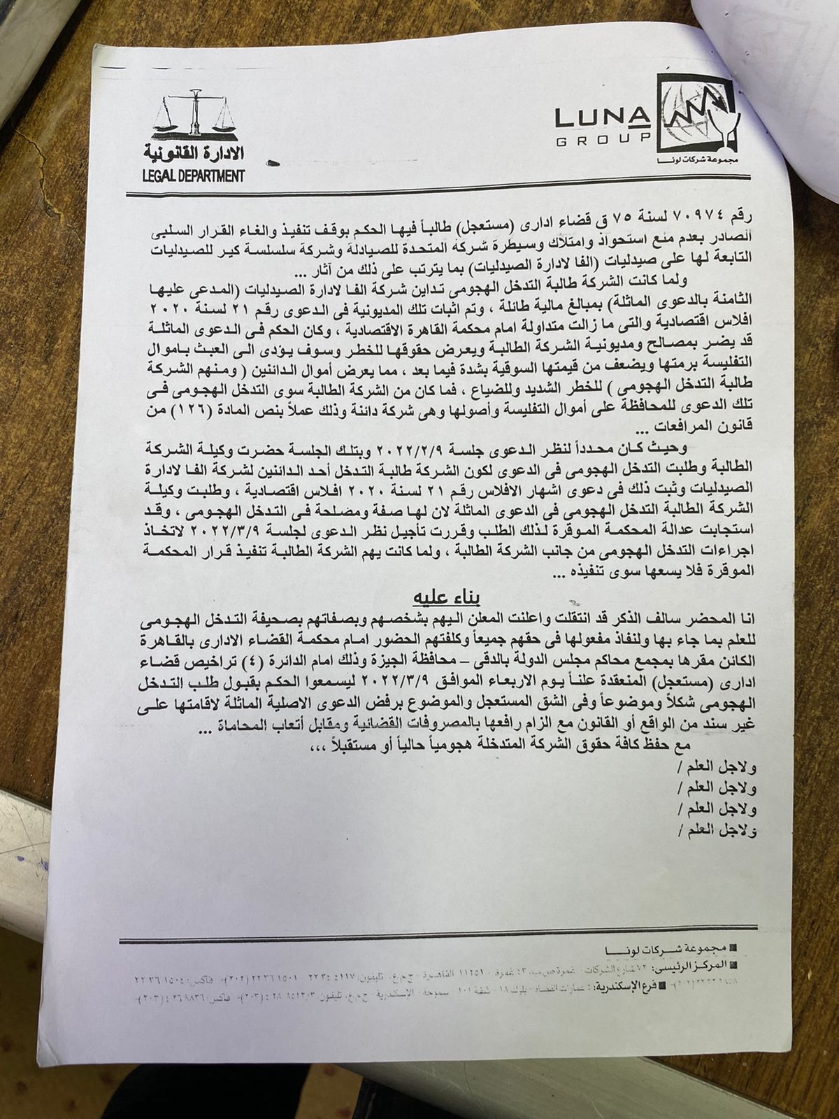 جدير بالذكر صدور حكم من المحكمة الاقتصادية بإفلاس سلسلة صيدليات ١٩٠١١.