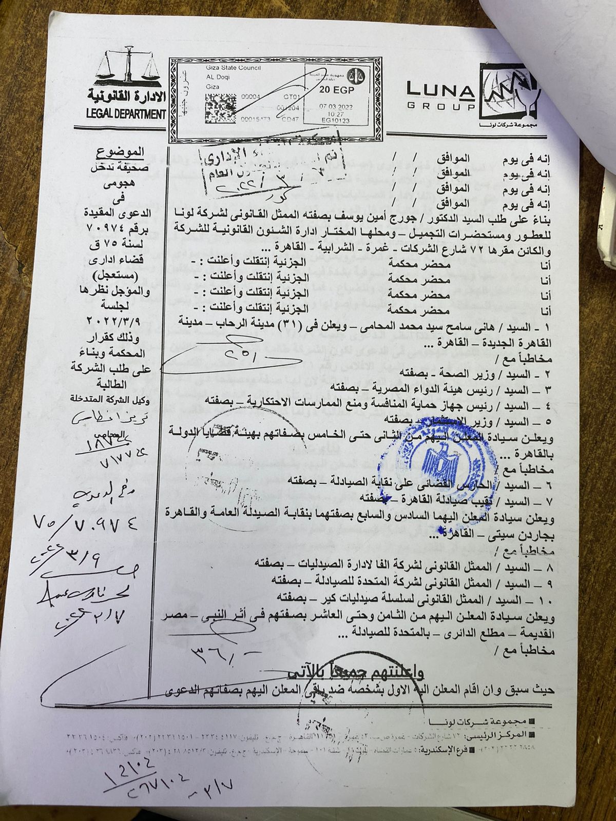 وقال هاني سامح في دعواه إن الديون سبب الاستحواذ والقانون يحظر ملكية الشركات للصيدليات ويحظر ملكية أكثر من صيدليتين حماية لفئة الصيادلة من تغول أباطرة الأموال.