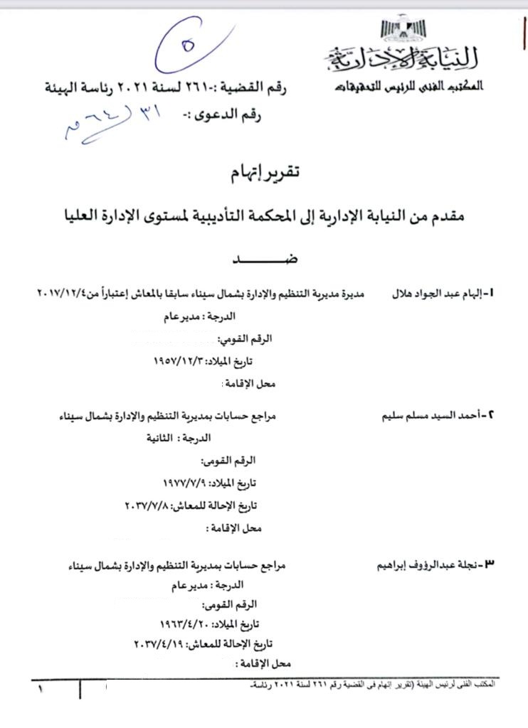إحالة مديرة التنظيم والإدارة بـ شمال سيناء و4 مسئولين للمحاكمة العاجلة