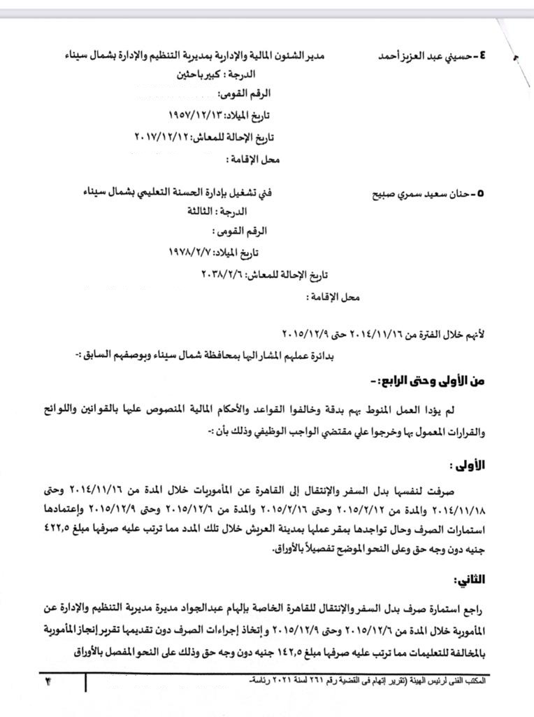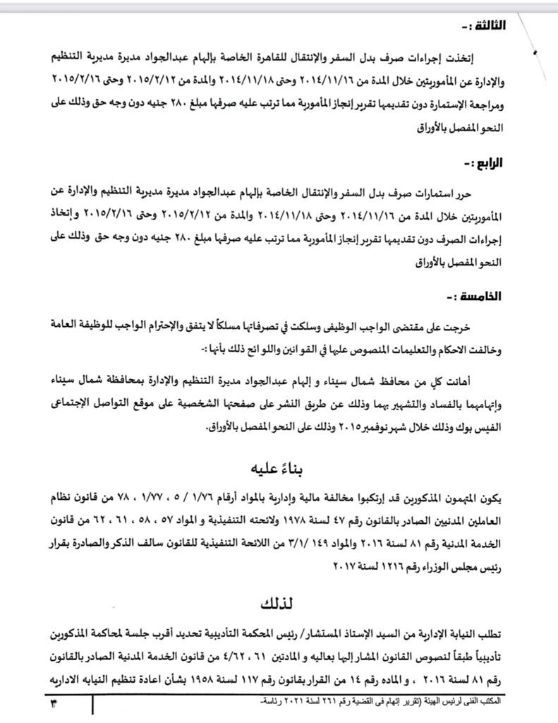 وراجع أحمد السيد مسلم، مراجع حسابات بمديرية التنظيم والإدارة بشمال سيناء استمارة صرف بدل السفر والانتقال للقاهرة الخاصة بالمحالة الأولى إلهام عبد الجواد هلال، مديرة مديرية التنظيم والإدارة بشمال سيناء، واتخذ إجراءات الصرف دون تقديمها تقرير إنجاز المأمورية بالمخالفة للتعليمات مما ترتب عليه قيامها بصرف مبالغ مالية دون وجه حق