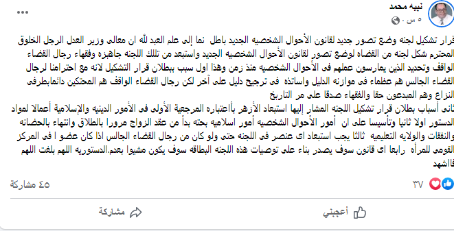 وأضاف في منشور عبر صفحته الشخصية عبر موقع التواصل الاجتماعي “فيس بوك" أسباب بطلان قرار تشكيل اللجنة المشار إليها استبعاد الأزهر باعتباره المرجعية الأولى في الأمور الدينية والإسلامية أعمالًا لمواد الدستور أولًا ثانيًا وتأسيسًا على أن أمور الأحوال الشخصية أمور إسلامية بحتة بدأ من عقد الزواج مرورًا بالطلاق وانتهاءً بالحضانة والنفقات والولاية التعليمية.