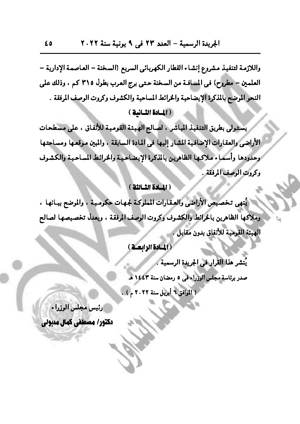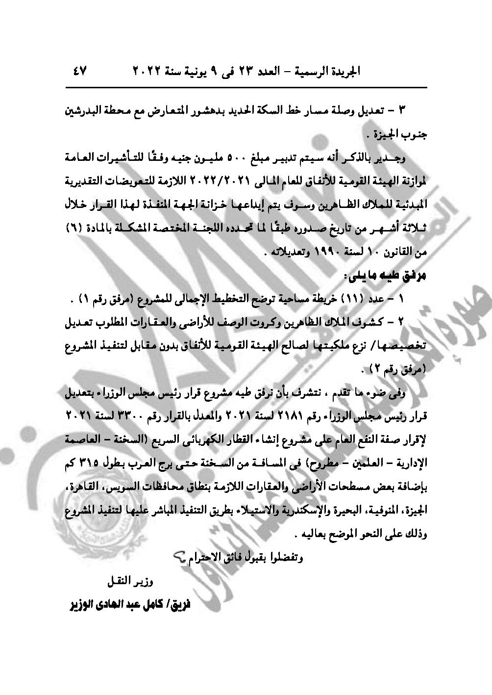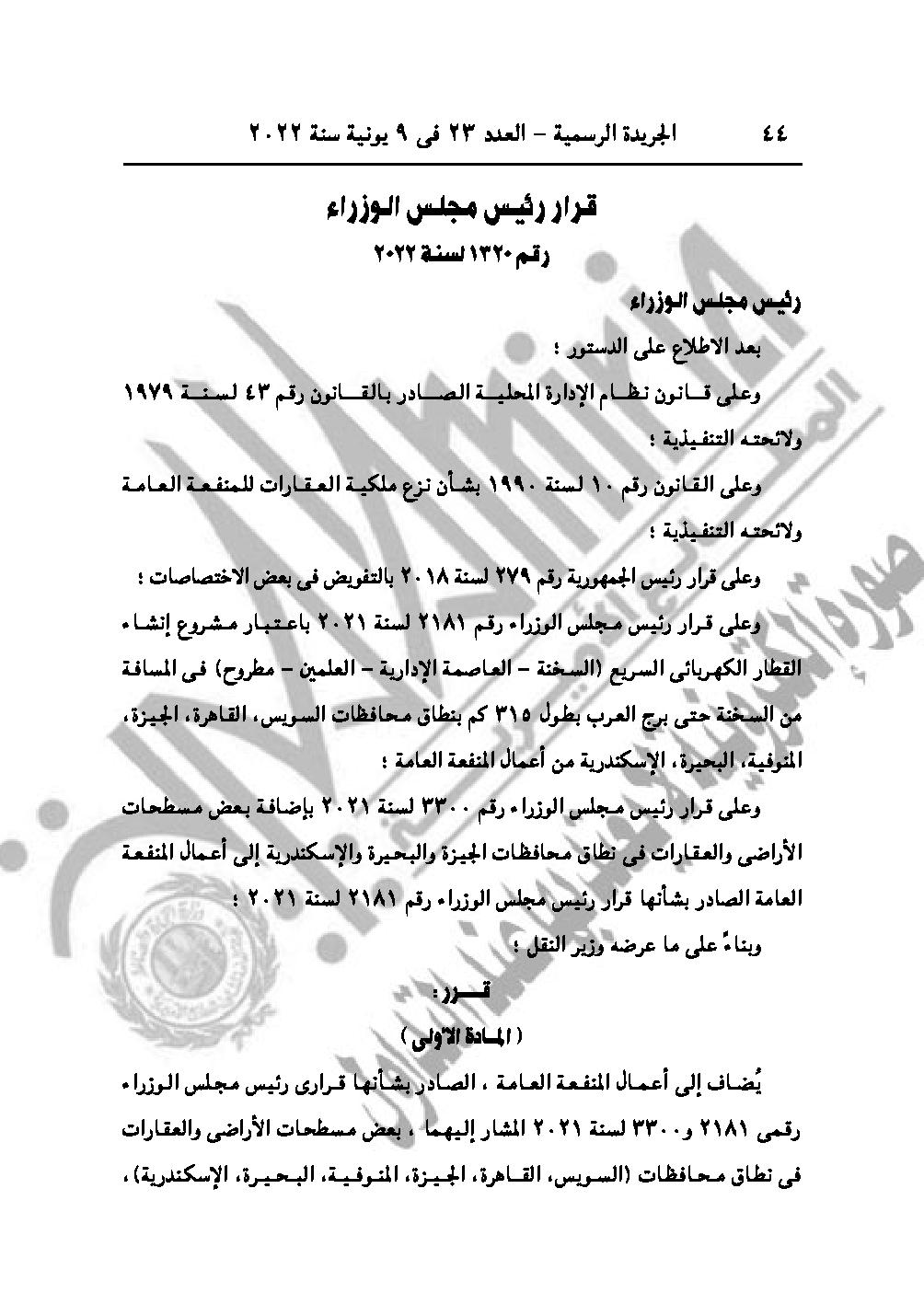 نشرت الجريدة الرسمية في عددها رقم 23، الصادر في 9 يونيو 2022، قرار رئيس الوزراء الدكتور مصطفى مدبولي رقم 1320 لسنة 2022، بشأن الاستيلاء على الأراضي والعقارات في 6 محافظات لتنفيذ مشروع إنشاء القطار الكهربائي السريع.