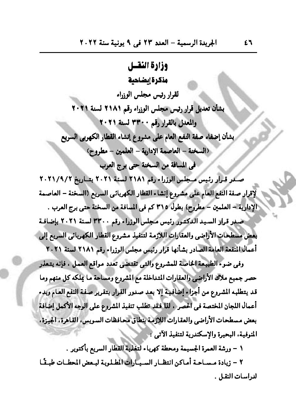وينص القرار في مادته الأولى على أن يُضاف إلى أعمال المنفعة العامة الصادر بشأنها قرارى رئيس مجلس الوزراء رقمى 2181 و3300 لسنة 2021، بعض المسطحات الأراضي والعقارات في نطاق محافظات (السويس، القاهرة، الجيزة، المنوفية، البحيرة، الإسكندرية)، اللازمة لتنفيذ مشروع إنشاء القطار الكهربائي السريع (السخنة- العاصمة الإدارية- العلمين- مطروح) في المسافة من السخنة حتى برج العرب بطول 315 كيلو متر.