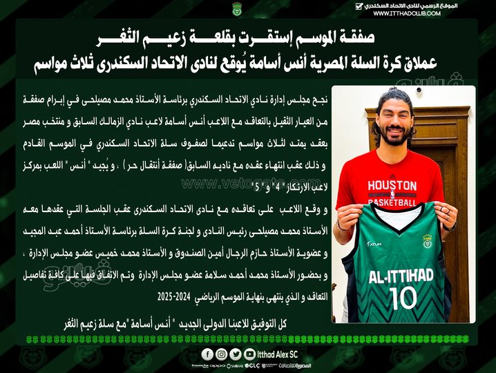 أعلن نادي الاتحاد السكندري برئاسة محمد مصيلحي تعاقده رسميا مع عملاق كرة السلة أنس أسامة لاعب نادي الزمالك ومنتخب مصر تدعيما لصفوفه استعدادا للموسم الجديد.
