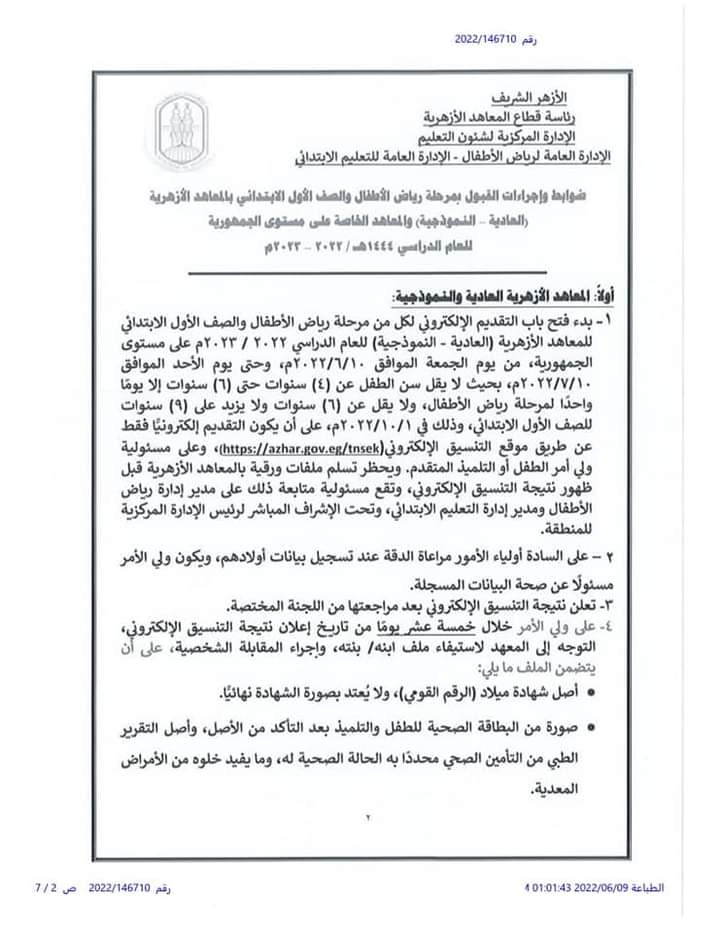 واشترط الأزهر أن يكون سن الطفل لا يقل عن أربع سنوات ولا يزيد عن 6 سنوات إلا يوم واحد لمرحلة رياض الأطفال، ولا يقل عن 6 سنوات ولا يزيد عن 9 سنوات للصف الأول الإبتدائي وذلك يوم 1 أكتوبر القادم.