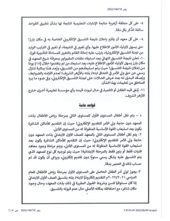 وأوضح الأزهر أن التقديم يكون من خلال الموقع الرسمي للتنسيق عبر بوابة الأزهر الإلكترونية على أن يحظر على أوليا الأمور التقدم بأي ملفات ورقية للمعاهد قبل ظهور نتيجة التنسيق الإلكتروني.