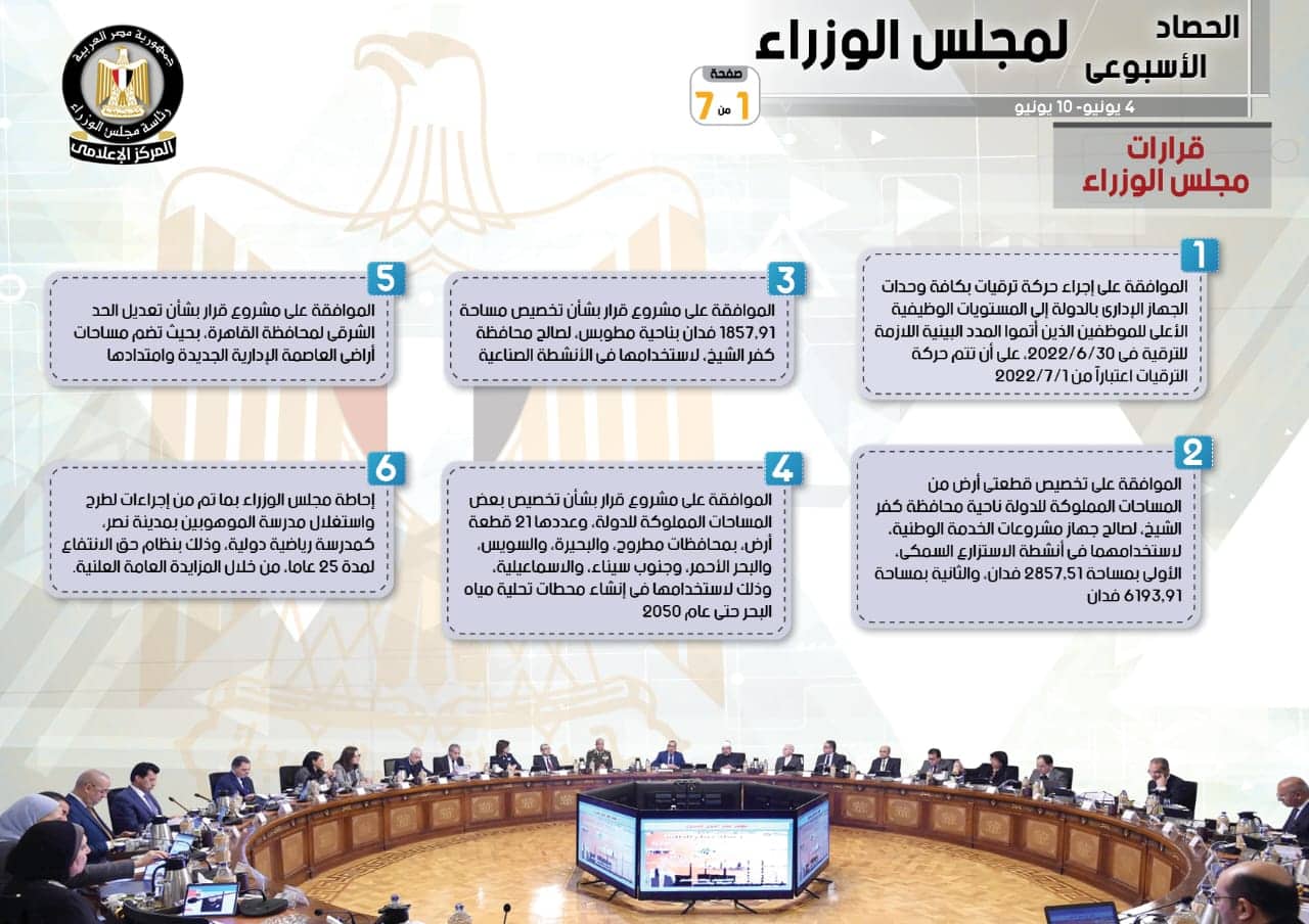 وجاء في التقرير أنه تم إصدار عدد من قرارات مجلس الوزراء تشمل قرارًا بالموافقة على إجراء حركة ترقيات بكافة وحدات الجهاز الإداري بالدولة إلى المستويات الوظيفية الأعلى للموظفين الذين أتموا المدد البينية اللازمة للترقية في 30/6/2022، على أن تتم حركة الترقيات اعتبارًا من 1/7/2022، بالإضافة إلى الموافقة على مشروع قرار بشأن تخصيص مساحة 1857.91 فدان بناحية مطوبس، لصالح محافظة كفر الشيخ، لاستخدامها في الأنشطة الصناعية.