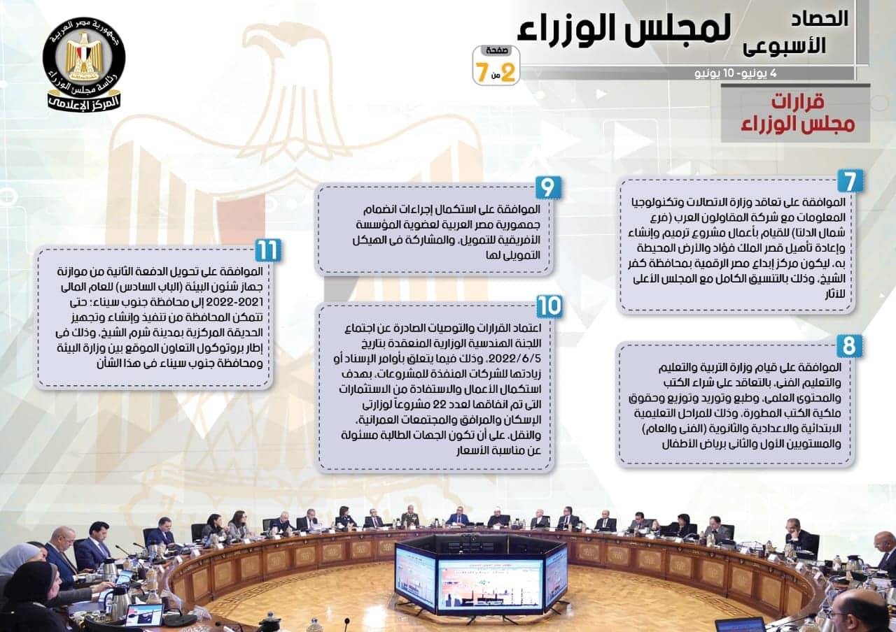 واستكمالًا لـ قرارات مجلس الوزراء أشار التقرير إلى أنه قد تمت اعتماد القرارات والتوصيات الصادرة عن اجتماع اللجنة الهندسية الوزارية المنعقدة بتاريخ 5/6/2022، وذلك فيما يتعلق بأوامر الإسناد أو زيادتها للشركات المنفذة للمشروعات، بهدف استكمال الأعمال والاستفادة من الاستثمارات التي تم إنفاقها لعدد 22 مشروعًا لوزارتي الإسكان والمرافق والمجتمعات العمرانية، والنقل، على أن تكون الجهات الطالبة مسئولة عن مناسبة الأسعار، وكذلك الموافقة على استكمال إجراءات انضمام جمهورية مصر العربية لعضوية المؤسسة الأفريقية للتمويل، والمشاركة في الهيكل التمويلي لها، فضلًا عن الموافقة على تحويل الدفعة الثانية من موازنة جهاز شئون البيئة (الباب السادس) للعام المالي 2021-2022 إلى محافظة جنوب سيناء؛ حتى تتمكن المحافظة من تنفيذ وإنشاء وتجهيز الحديقة المركزية بمدينة شرم الشيخ، وذلك في إطار بروتوكول التعاون الموقع بين وزارة البيئة ومحافظة جنوب سيناء في هذا الشأن.