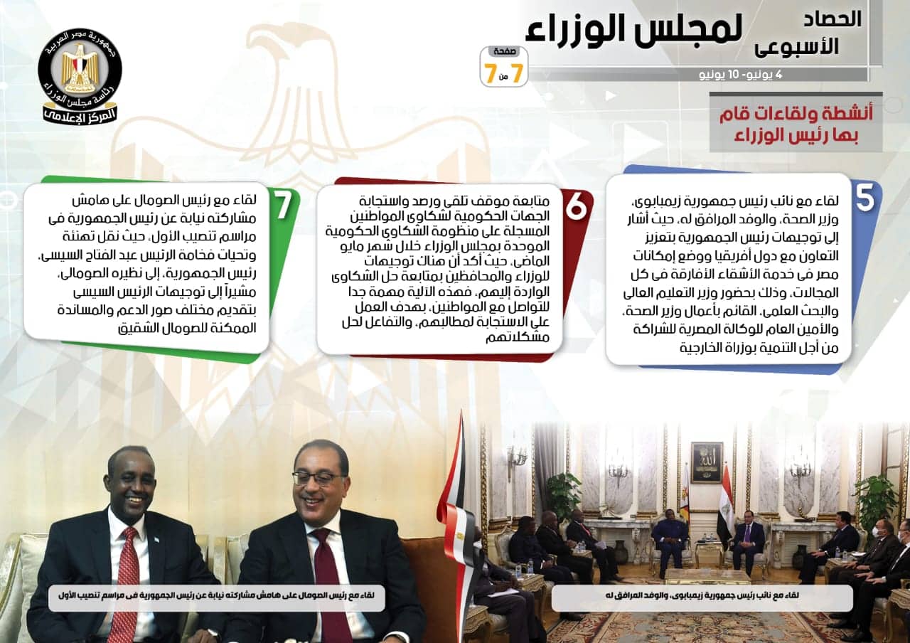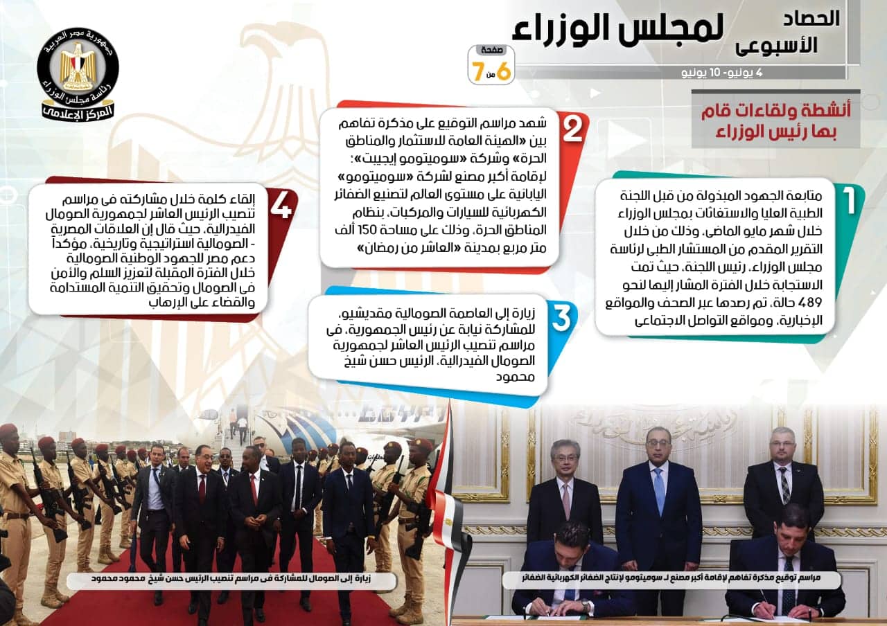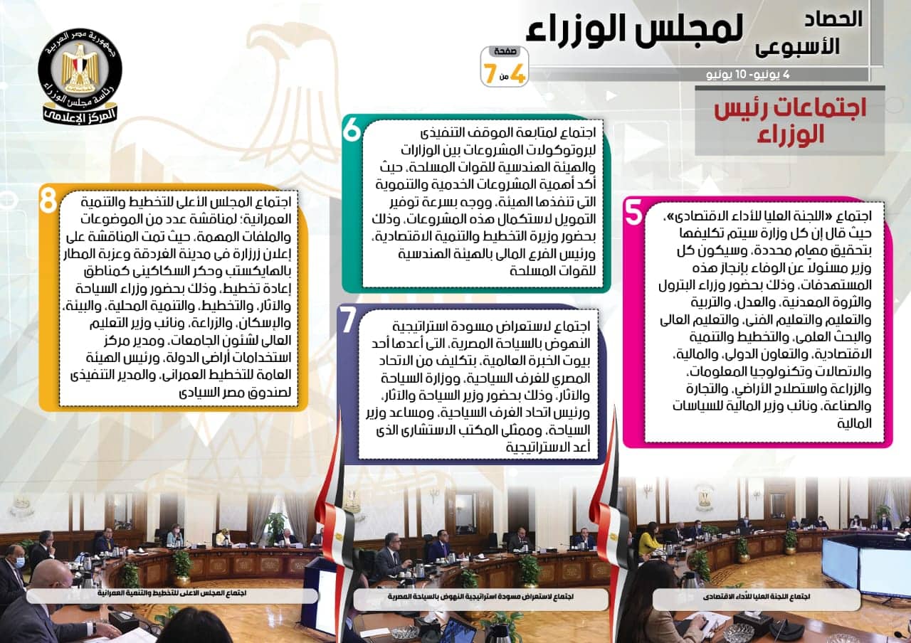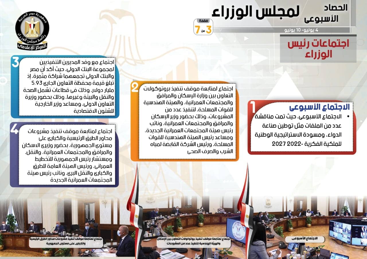نشر المركز الإعلامي لمجلس الوزراء، تقريرًا شمل إنفوجرافات سلط من خلالها الضوء على الحصاد الأسبوعي لمجلس الوزراء، وذلك خلال الفترة من 4 يونيو حتى 10 يونيو 2022، والذي تضمن الموافقة على عدد من القرارات، فضلًا عن الاجتماعات واللقاءات التي عقدها الدكتور مصطفى مدبولي، رئيس مجلس الوزراء، بالإضافة إلى ما قام به من أنشطة.
