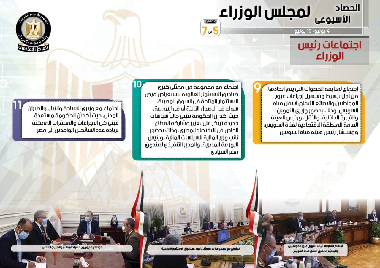 وتضمنت الاجتماعات أيضًا، وفقًا لما أبرزه التقرير، اجتماع "اللجنة العليا للأداء الاقتصادي"، حيث قال إن كل وزارة سيتم تكليفها بتحقيق مهام محددة، وسيكون كل وزير مسئولًا عن الوفاء بإنجاز هذه المستهدفات، وذلك بحضور وزراء البترول والثروة المعدنية، والعدل، والتربية والتعليم والتعليم الفني، والتعليم العالي والبحث العلمي، والتخطيط والتنمية الاقتصادية، والتعاون الدولي، والمالية، والاتصالات وتكنولوجيا المعلومات، والزراعة واستصلاح الأراضي، والتجارة والصناعة، ونائب وزير المالية للسياسات المالية، بالإضافة إلى اجتماع مع وفد المديرين التنفيذيين لمجموعة البنك الدولي، حيث أكد أن مصر والبنك الدولي تجمعهما شراكة مثمرة، إذ تبلغ قيمة محفظة التعاون الجاري 5.93 مليار دولار، وذلك في قطاعات تشمل الصحة والنقل والبيئة وغيرها، وذلك بحضور وزيرة التعاون الدولي، ومساعد وزير الخارجية للشئون الاقتصادية، فضلًا عن اجتماع لمتابعة الموقف التنفيذي لبروتوكولات المشروعات بين الوزارات والهيئة الهندسية للقوات المسلحة، حيث أكد أهمية المشروعات الخدمية والتنموية التي تنفذها الهيئة، ووجه بسرعة توفير التمويل لاستكمال هذه المشروعات، وذلك بحضور وزيرة التخطيط والتنمية الاقتصادية، ورئيس الفرع المالي بالهيئة الهندسية للقوات المسلحة.